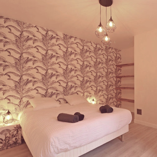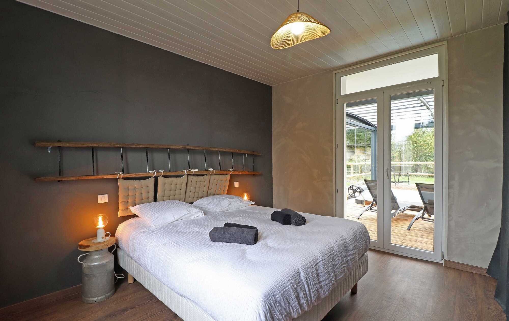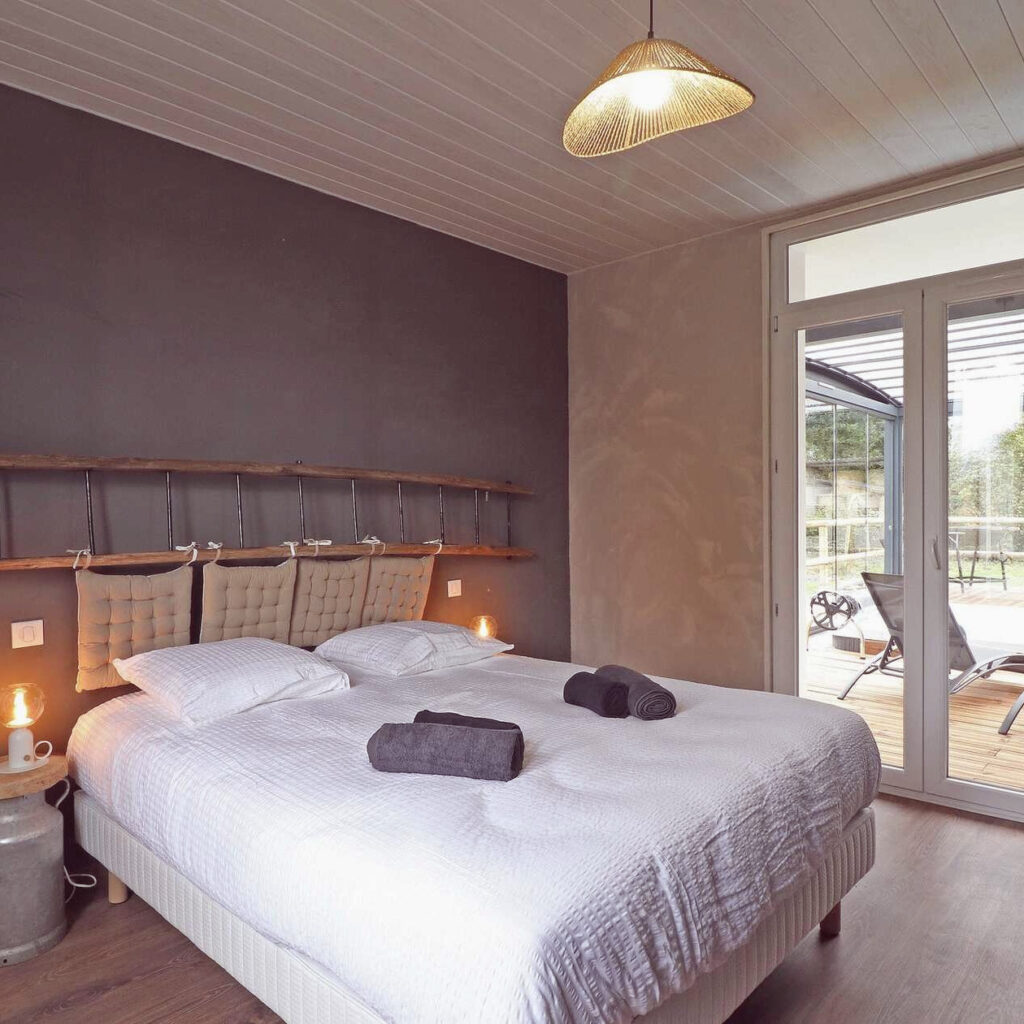 Nichée au rez-de-chaussée, cette chambre pour trois personnes offre un refuge calme, légèrement à l’écart des espaces de vie. Elle communique directement avec l’espace spa, prolongeant naturellement les moments de détente.