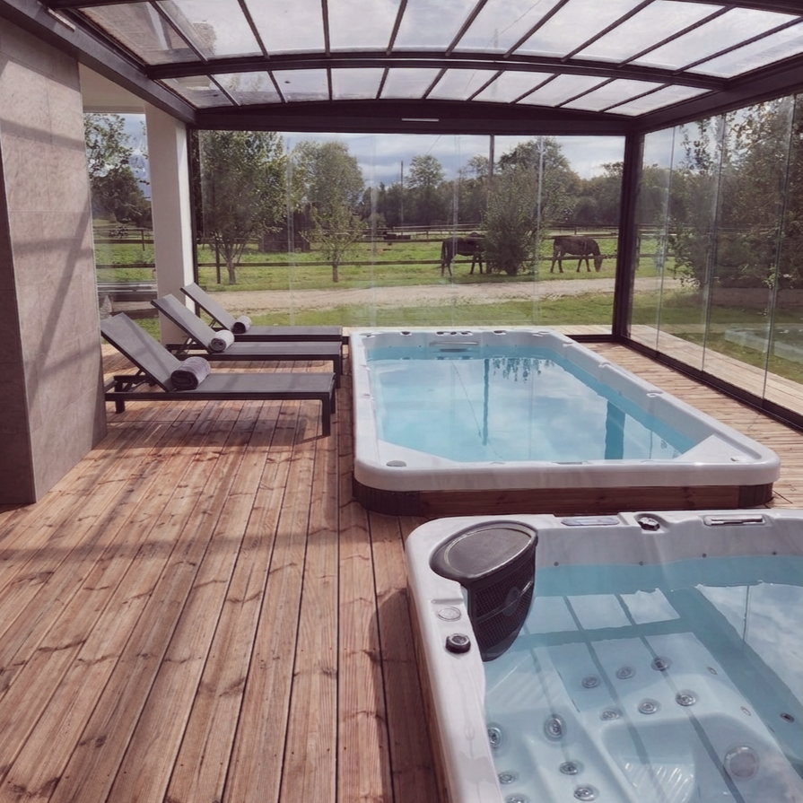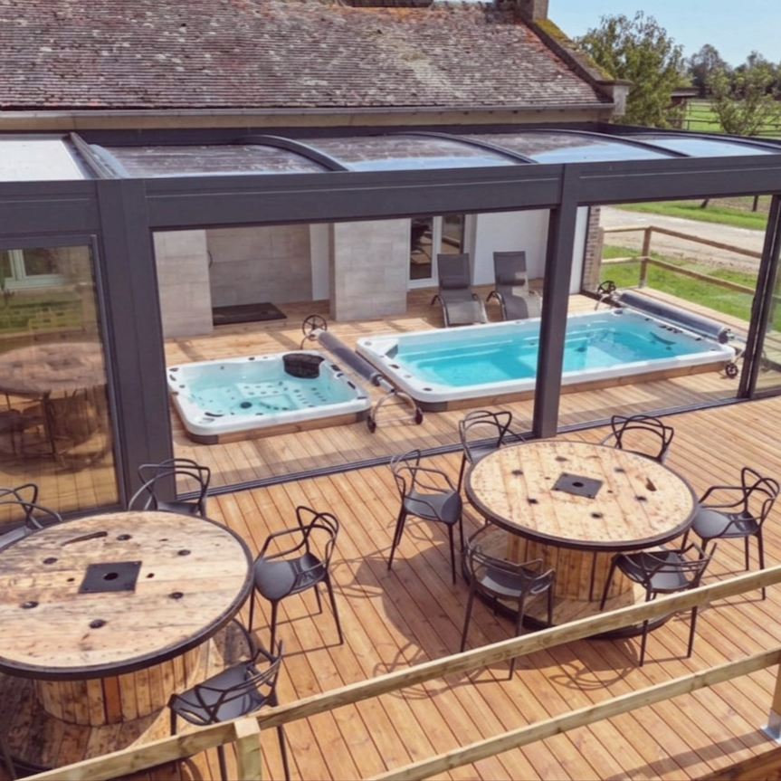 En été, notre cocon s’étend aux extérieurs. L’espace spa s’ouvre pour se prolonger sur cette immense terrasse. Le jardin, à votre disposition vous offrira un contact direct et ressourçant avec la nature verdoyante.