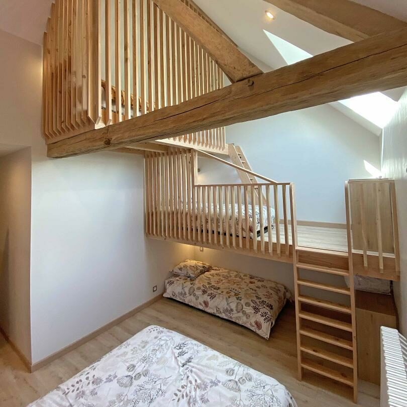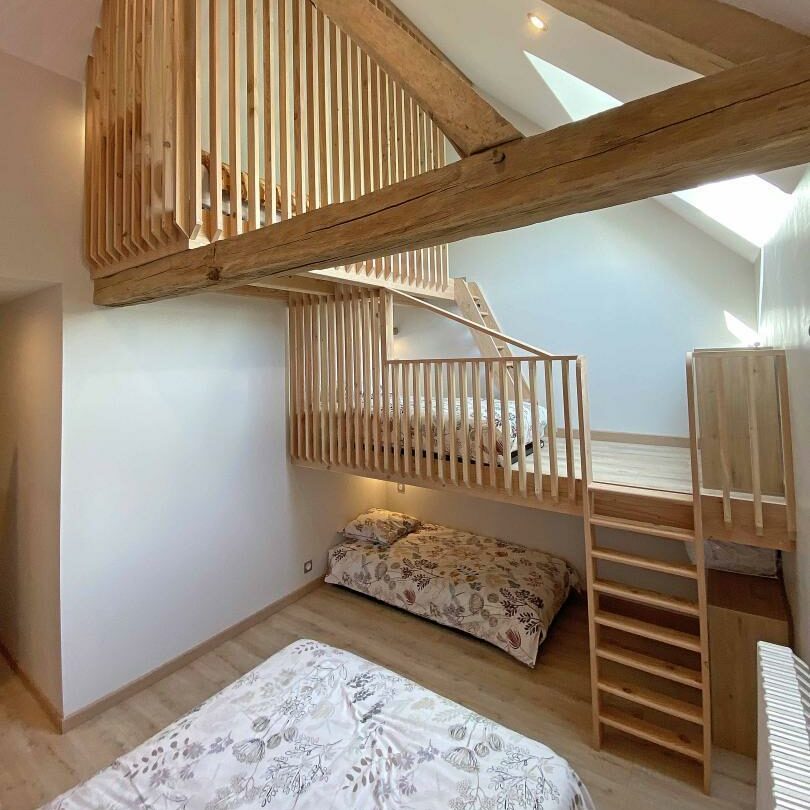 Dans le dortoir (à l’étage), plusieurs lits simples sont situés en mezzanine.